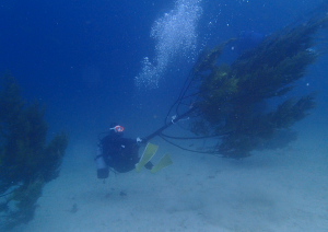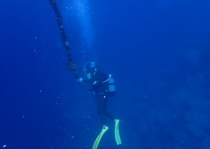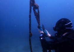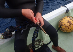 まずは水中に入って古いロープを根本から切っていきます。