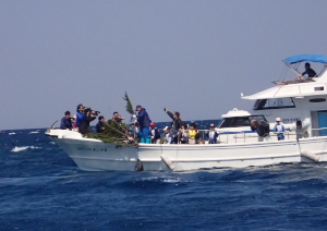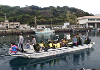 小学生は、2班に分かれて船に乗り込み、思い思いの松の木を水中に沈めていきます。