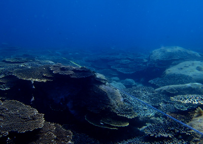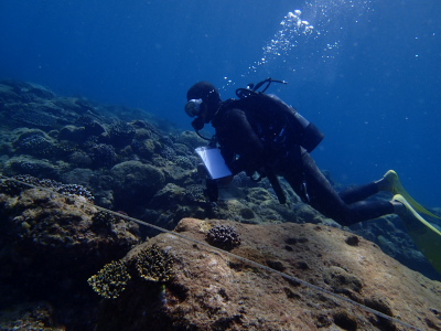 リーフチェックは毎年同じ場所に長さ100メートルのメジャーを引き、水深3メートルと10メートルのラインを調べていきます。