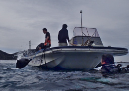 前回できなかったポイントのブイのロープの補修作業をしてきました!! 土嚢を船に積み込みポイントまで行ってると・・・
