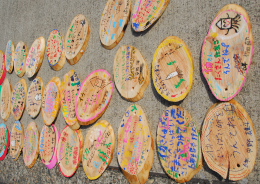 そして、小学生が作ってきてくれたイカへのメッセージ入りの木の丸い板を沈める木に結束バンドで結んで準備完了!!