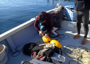 土嚢を落とし終わると、みんなで潜って海中で土嚢を集めてブイのロープにしっかり固定して完成!!
