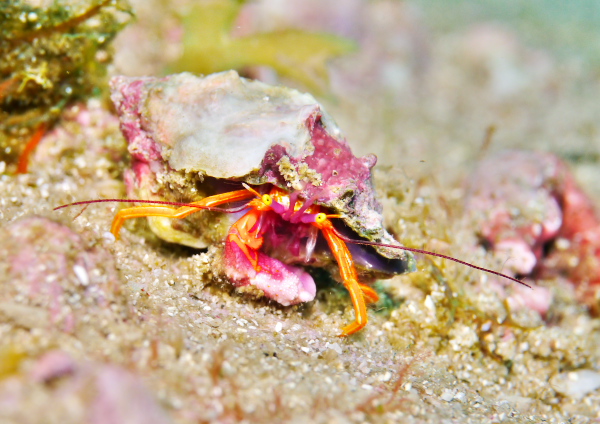 浅場にかえってくる途中に岩の隙間のぞくと綺麗なヤドカリがいましたよ~(^^♪