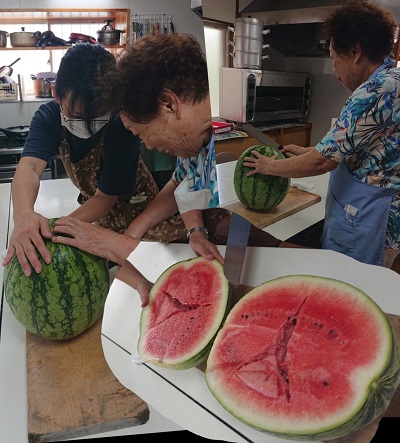 結構重くて切るのも2人がかりのスイカ。