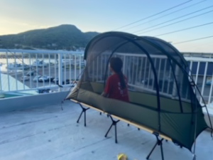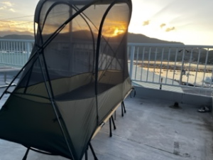 さて、通常ならお盆休み期間の混み合う日程。なので、今回パラディで宿がとれず島内の民宿さんも満室だった常連ゲストさん。キャンプをするとは聞いていましたが、ここでした(笑)。どこか分かりまか?パラディ2Fのテラスです。朝の出勤時、何が置いてあるんだろう??と思ったら、テントでした(笑)。ご本人さんいわく、夜はとても涼しくて星もキレイで快適だったとのこと。ご使用のテントが蚊帳のタイプなので、景色もきちんと見えるんですね(^^♪ お部屋をご準備できなくても申し訳なかったですが、それなりに満足していただけたようで良かったです♪ 風邪、ひかないでくださいね。