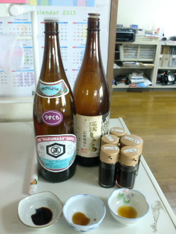 只今、利き酒ならぬ「利き醤油」をしてます(^^ゞ。パラディで使っている醤油は『マルマサ醤油』で、この辺の方は割と使っているのではないでしょうか。といっても、量販店などではほとんど見かけませんが・・)^o^(。 とても甘口で、刺身醤油に至っては、超甘口といった感じです。刺身の味が際立ってとても美味しいのですが、これが苦手といったゲストさんも結構います(^_^;)。常連ゲストさんの中には、醤油を持参で来られている方もいるので、それは申し訳ないと・・・(-“-)。。。で、頂きものですが和歌山の湯浅醤油を出してみることにしました。