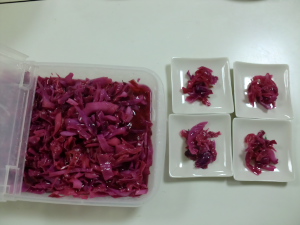 紫キャベツも頂いたので、ピクルスを作ってみました。お酢に浸すと綺麗なピンク色に変身です。遠藤君には「漬物ですか~?」と言われましたが、まぁそうですね、漬物です^_^;。