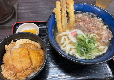 このメニューは肉ごぼ天うどんとミニカツとじセット。人気No.1商品です。