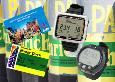 エンリッチド・エアを使う場合は、PADIのエンリッチSP(エンリッチド・エア・ダイバー・スペシャルティ・コース)など、各ダイビング指導団体によるエンリッチSPに該当する資格が必要となります。