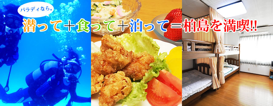 せっかく柏島に来たんだから1日じゃもったいない!1泊・2泊・3泊・・・長期滞在でもパラディなら大丈夫!宿泊施設も併設しているから、面倒な移動もなくって楽々!ゆっくり潜って、美味しく食べて、のんびり泊まって、柏島の海をおもいっきり満喫して頂けます!!